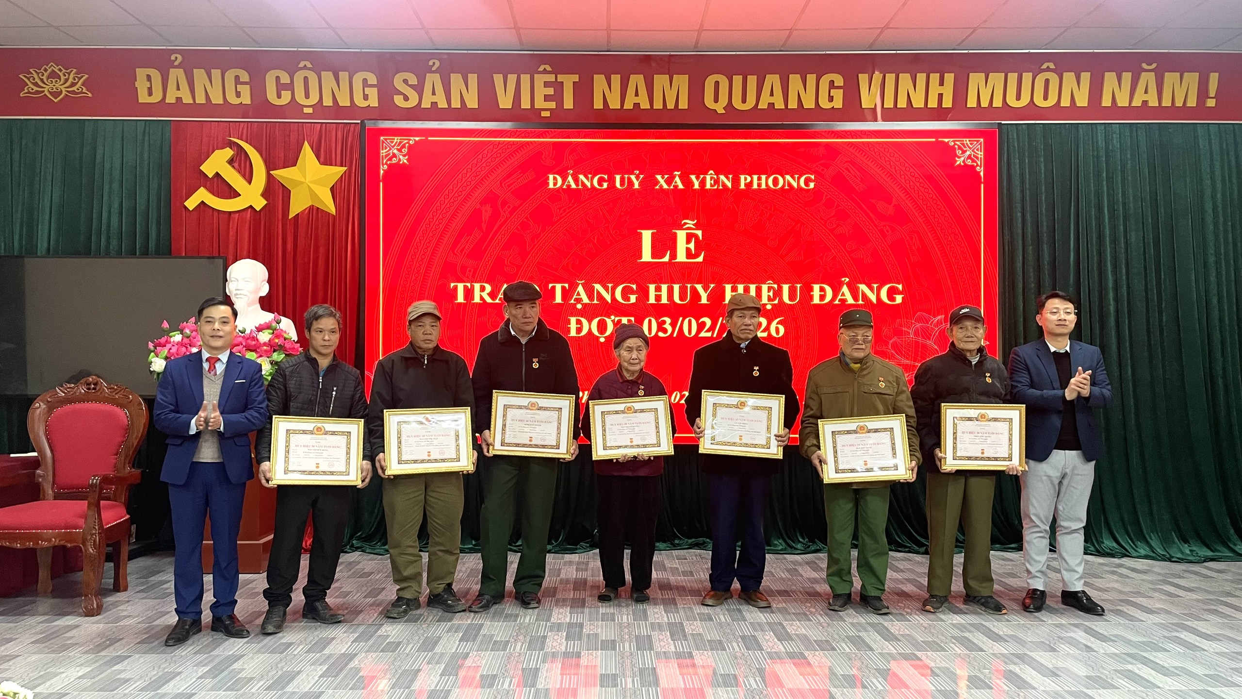 Trong đợt trao tặng Huy hiệu Đảng 03/02/2026, Đảng bộ xã Yên Phong có 13 đồng chí đảng viên vinh dự được nhận phần thưởng cao quý của Đảng. Trong đó, có 01 đảng viên nhận Huy hiệu 60 năm tuổi Đảng; 01 đảng viên nhận Huy hiệu 55 năm tuổi Đảng; 03 đảng viên nhận Huy hiệu 50 năm tuổi Đảng; 01 đảng viên nhận Huy hiệu 45 năm tuổi Đảng; 01 đảng viên nhận Huy hiệu 40 năm tuổi Đảng; 06 đảng viên nhận Huy hiệu 30 năm tuổi Đảng. Đây là sự ghi nhận của Đảng đối với những đóng góp, cống hiến bền bỉ của các đảng viên lão thành trong sự nghiệp cách mạng, xây dựng và bảo vệ Tổ quốc cũng như trong quá trình xây dựng Đảng và phát triển địa phương.