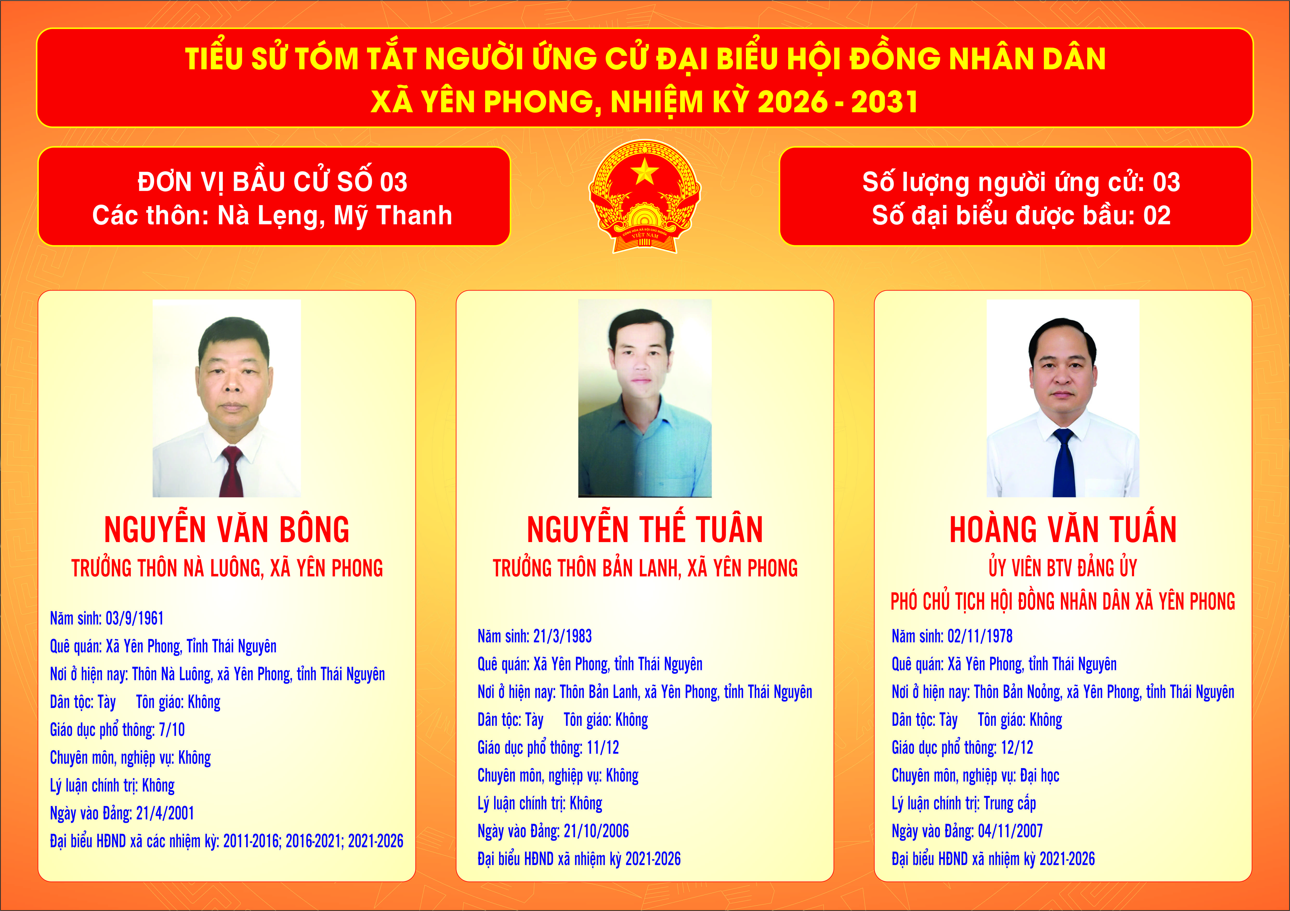 Tiểu sử tóm tắt những người ứng cử đại biểu HĐND xã Yên Phong, nhiệm kỳ 2026-2031 tại đơn vị bầu cử số 3, gồm các thôn: Nà Lẹng, Mỹ Thanh. Số lượng người ứng cử: 03; số đại biểu được bầu: 02.