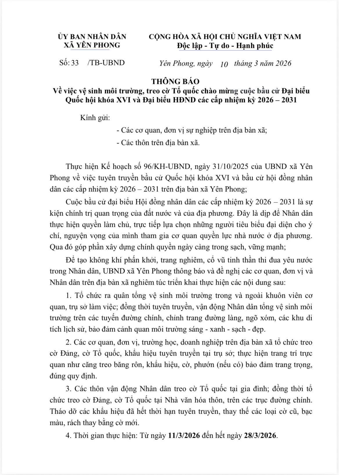 Hướng tới ngày hội lớn của toàn dân — Cuộc bầu cử đại biểu Quốc hội khóa XVI và đại biểu HĐND các cấp nhiệm kỳ 2026 – 2031, UBND xã Yên Phong Thông báo đến các cơ quan, đơn vị sự nghiệp, các thôn trên địa bàn xã tổ chức vệ sinh môi trường, treo cờ Tổ quốc.