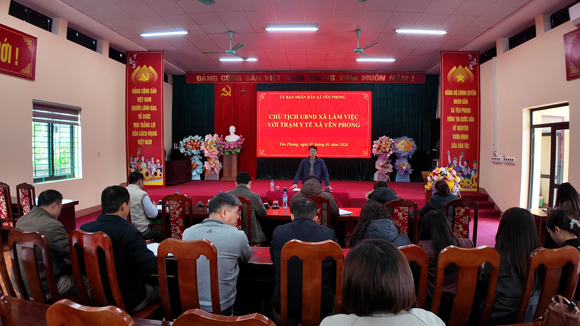 Chiều ngày 07/01/2026, đồng chí Chu Văn Triều, Phó Bí thư Đảng ủy, Chủ tịch UBND xã đã có buổi làm việc với lãnh đạo và viên chức Trạm Y tế xã Yên Phong sau sắp xếp. Tham dự buổi làm việc có đồng chí Long Thị Hải, Phó Chủ tịch UBND xã; lãnh đạo Phòng Kinh tế, Phòng Văn hóa – Xã hội xã.